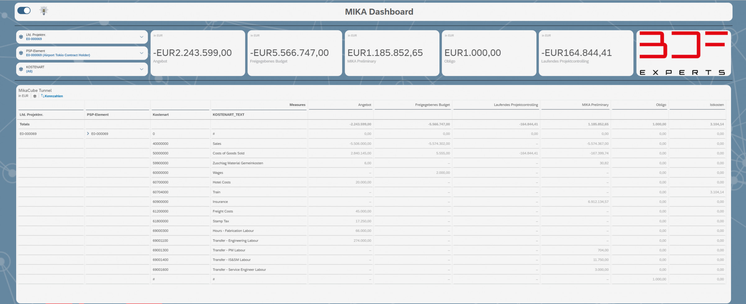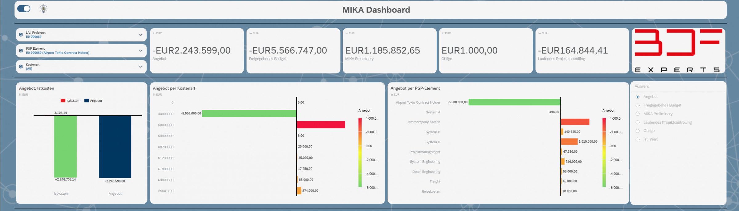 The architecture of MIKA, which is shown in the attached architecture diagram [reference to architectural graphic in PDF below], shows the direct connection from the PPG (portfolio/quota) via the Project System to the SAC MIKA Dashboard. This underscores the end-to-end transparency that is essential for effective project controlling.