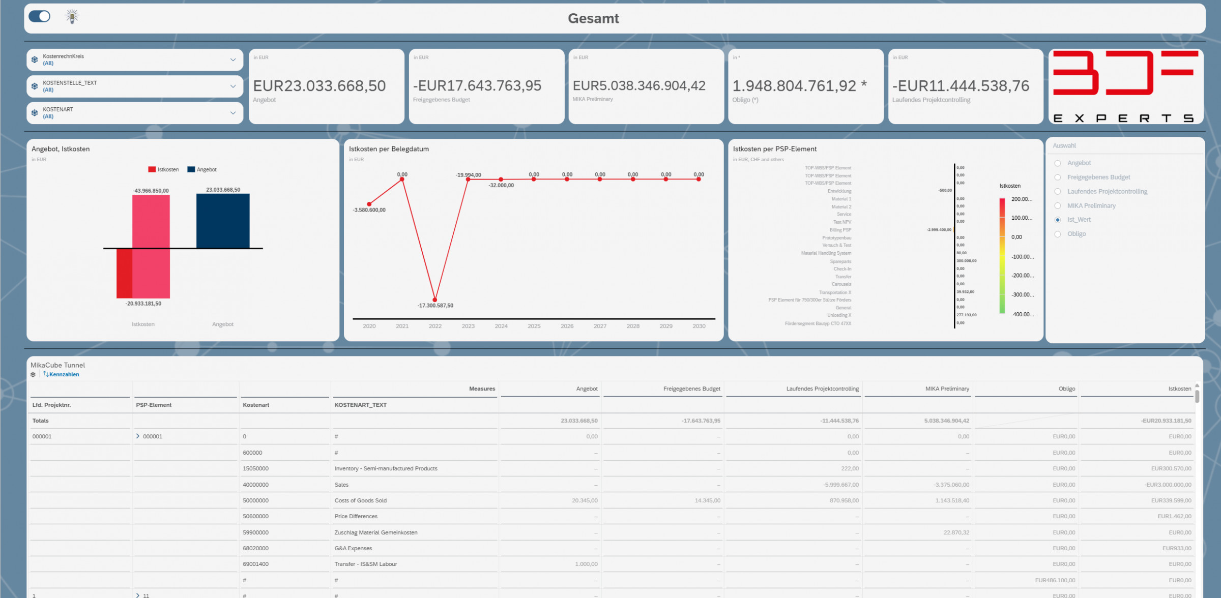 PPG-MIKA from BDF EXPERTS closes the gap between the data complexity of S/4HANA and the need for real-time transparency in project controlling. Through the consistent use of SAP Analytics Cloud Live Connection and high-performance CDS views, SAP finance managers and controllers get a tool that: