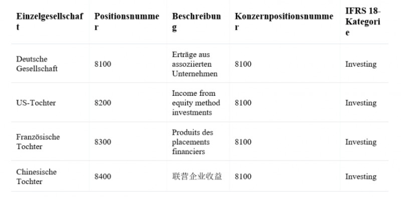 Dieses Mapping zeigt, wie Positionen aus verschiedenen Einzelgesellschaften auf die gleiche Konzernpositionsnummer abgebildet werden und alle der gleichen IFRS 18-Kategorie zugeordnet werden