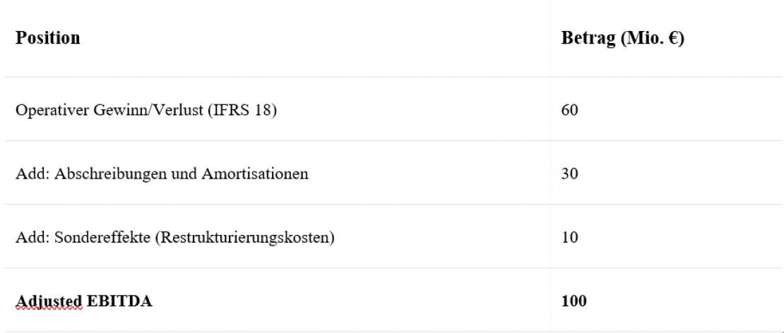 Angenommen, ein Unternehmen kommuniziert extern ein „Adjusted EBITDA" von 100 Millionen Euro. Die Überleitung könnte wie folgt aussehen: